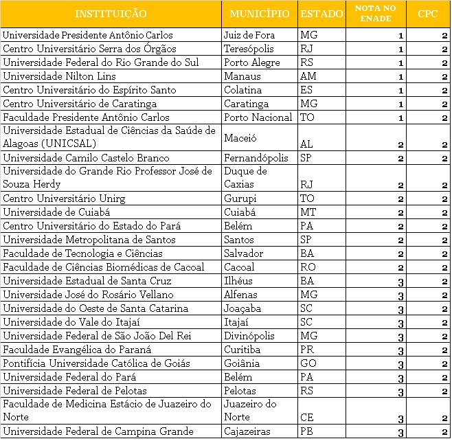 Por isso, escolher onde você vai cursar sua faculdade, seja qual for o curso, é uma decisão muito importante, que deve ser tomada com cuidado, depois de muita pesquisa! E, para ajudá-los nessa decisão, o Blog do Enem traz, nesse post, dados fresquinhos sobre os cursos de Medicina do país. Dica 1: Medicina – o curso, a profissão e o mercado de trabalho – http://blogdoenem.com.br/medicina-curso-mercado-trabalho/Todo ano, o Ministério da Educação (MEC) avalia os cursos superiores de todo o Brasil. Os resultados dos ciclos de avaliação 2013 dos cursos superiores na área da saúde foram divulgados dia 18 de dezembro. Os cursos são avaliados de acordo com dois itens principais: o CPC (Conceito Preliminar do Curso), que avalia os cursos, e o IGC (Índice Geral do Curso), que avalia as instituições de ensino. A nota dada para o CPC pode variar de 1 até 5, sendo que, nesse conceito, são avaliados critérios como a nota do curso no Enade, a infraestrutura da instituição de ensino, a titulação dos professores, entre outros. Foram avaliados 154 cursos de Medicina, dos quais 27 foram considerados insatisfatórios pelo MEC, pois receberam CPC nível 2. Entre as instituições cujos cursos foram considerados insatisfatórios, estão 5 universidades federais: Universidade Federal de São João Del-Rei (UFSJ), Universidade Federal do Pará (UFPA), Universidade Federal do Rio Grande do Sul (UFRGS), Universidade Federal de Pelotas (UFPel) e Universidade Federal de Campina Grande (UFCG). Dica 2: Medicina – notas de corte Sisu 2014 para o curso de graduação – http://blogdoenem.com.br/sisu-2014-notas-corte-medicina/Veja abaixo a lista completa dos piores cursos de Medicina do país, segundo o MEC: